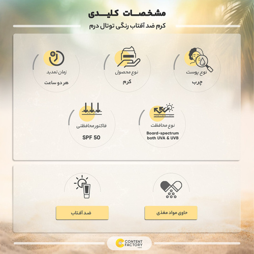 ضدآفتاب توتال درم با SPF 50 به خوبی از پوست شما در برابر انواع اشعههای مضر خورشید مراقبت میکند و می تواند از التهاب و لک های پوستی ناشی از تابش نور خورشید جلوگیری کند. این محصول مناسب پوست چرب است و از بروز جوش و آکنه در پوست شما پیشگیری میکند و همچنین با رنگ و پوشش و کاور مناسب، برای استفاده به عنوان فونداسیون آرایش مناسب بوده و شما را از استفاده چندین کرم بی نیاز می کند. ضد آفتاب توتال درم با ترکیبات ضد لک، به محو شدن لک های پوستی شما کمک می کند.
