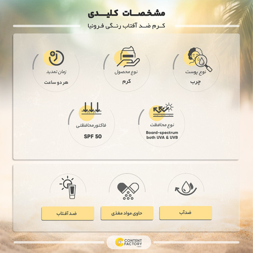 کرم ضد آفتاب فاقد چربی SPF50 فرونیا با پوشانندگی بالا و جذب سریع یک ضد افتاب ایده آل برای افراد با پوست چرب است. این محصول علاوه بر محافظت از پوست در برابر اشعه مضر نور خورشید، از ایجاد لک و چروک جلوگیری کرده و دارای خاصیت ضد التهاب، ضد قرمزی و ترمیم کننده نیز هست.